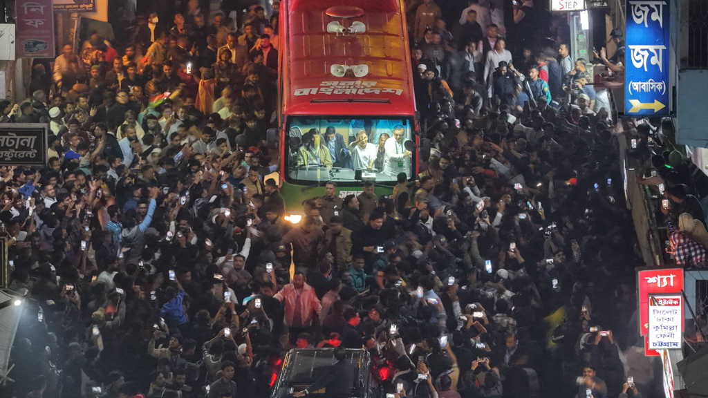 যাওয়ার পথে তারেক রহমানকে শুভেচ্ছা জানাতে সড়কের দুপাশে জড়ো হন হাজারো মানুষ। তারেক রহমানও বাসের ভেতর থেকে কর্মী-সমর্থকদের হাত নেড়ে শুভেচ্ছা জানান।